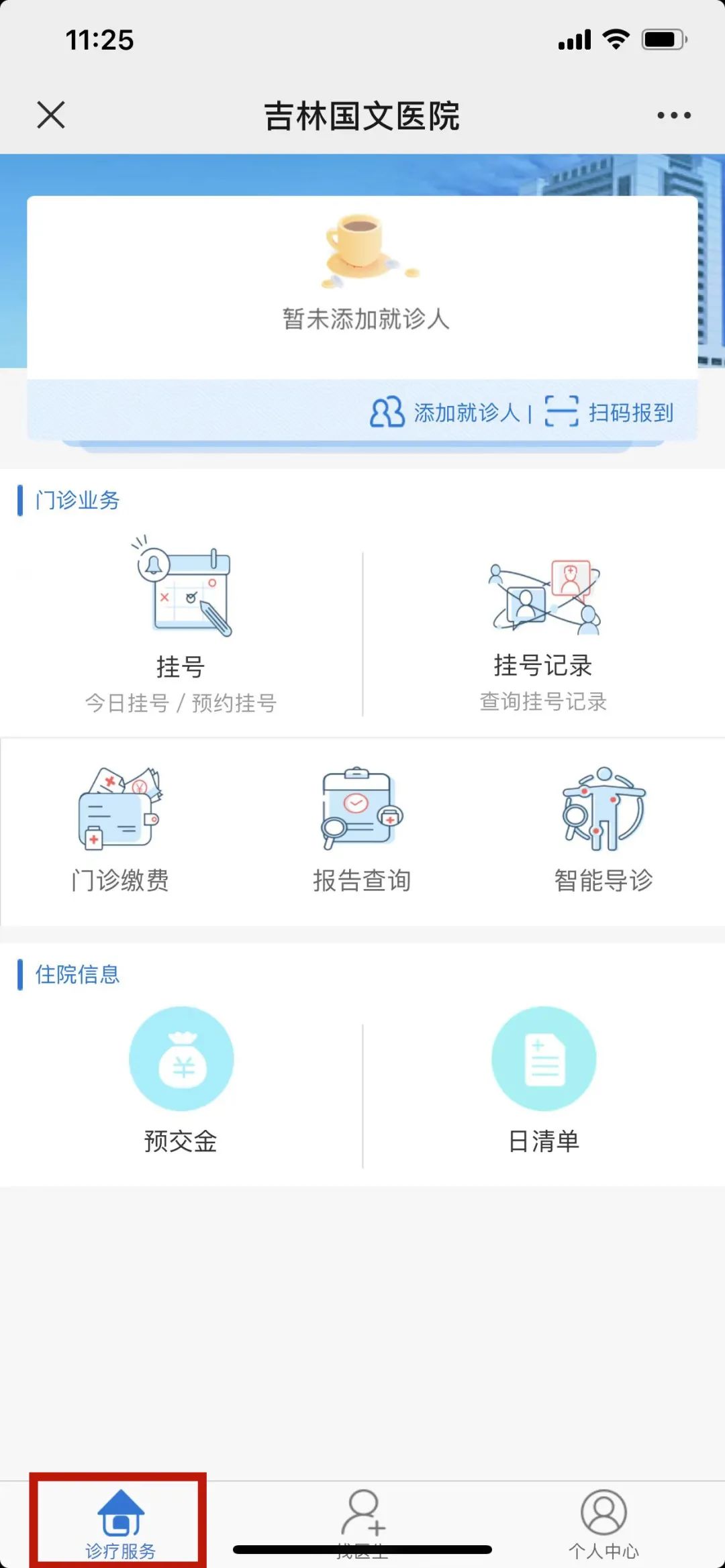 點擊服務(wù)號界面【微服務(wù)】中的【掛號繳費(fèi)】,進(jìn)入后選擇【診療服務(wù)】,進(jìn)入功能菜單界面。