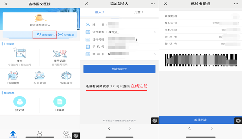 如患者之前在醫(yī)院就診過,則點擊主界面內(nèi)【添加就診人】進(jìn)入到綁卡界面,輸入姓名、身份證號、手機(jī)號,點擊【查詢就診卡】如可以綁定,則出現(xiàn)【綁定就診卡】點擊綁定,綁定完成后點擊【默認(rèn)就診卡】,可以查詢就診到卡明細(xì)。