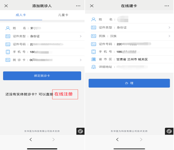 若患者之前沒有在醫(yī)院就診過,則在【添加就診人】界面點擊下方【在線注冊】,輸入姓名、民族、證件號碼(身份證)、手機(jī)號、詳細(xì)地址,點擊辦理生成就診卡。