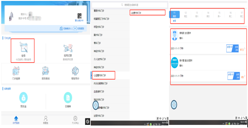 點擊功能菜單界面【掛號】選項,進(jìn)入到掛號界面,閱讀【掛號預(yù)約須知】并選擇【同意】,進(jìn)入掛號界面后【選擇科室】→【進(jìn)入科室】→【選擇醫(yī)生】→【支付掛號費(fèi)用】,如需預(yù)約掛號,請選擇需要預(yù)約的日期。