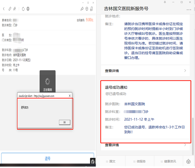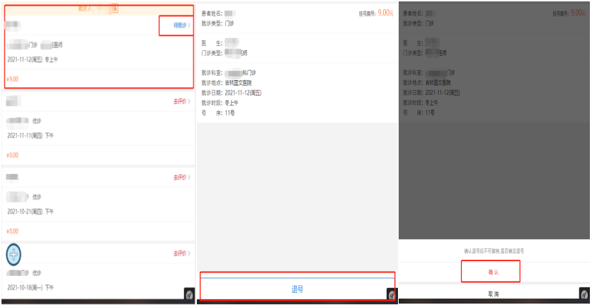 若更改就診計劃,需要取消掛號,點擊功能界面【掛號記錄】,進(jìn)入記錄界面后在已掛號項中點擊【待就診】,進(jìn)入界面后點擊【退號】,確認(rèn)無誤后點擊【確定】,會出現(xiàn)【退號成功】彈窗,掛號費(fèi)自動返回支付路徑(微信)。