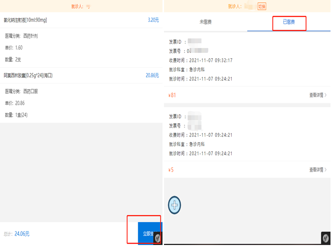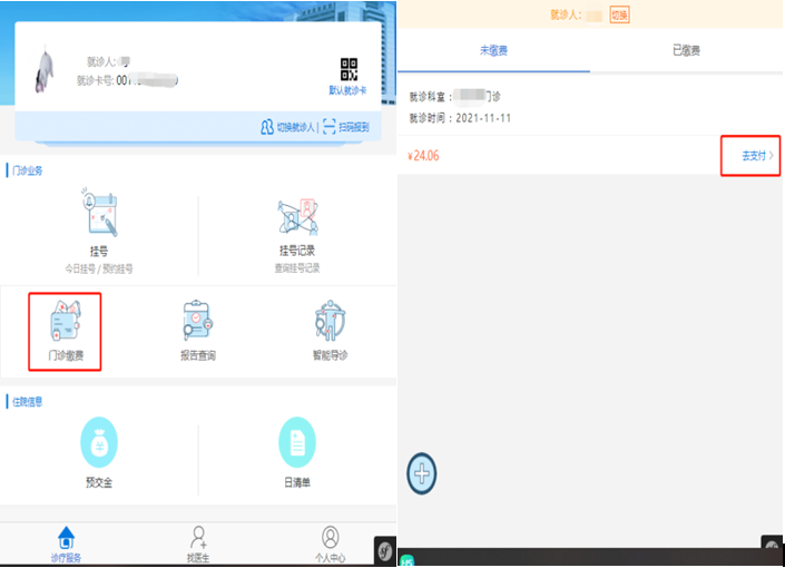 打開功能菜單界面,就診后點擊【門診繳費(fèi)】,進(jìn)入到門診繳費(fèi)界面,點擊【去支付】,會顯示所有需要繳納費(fèi)用的項目以及繳納金額,點擊【立即支付】會跳到支付界面,用微信支付即可(如需發(fā)票請到窗口領(lǐng)取),點擊【已繳費(fèi)】,可以查詢到所有繳納過的費(fèi)用明細(xì)。