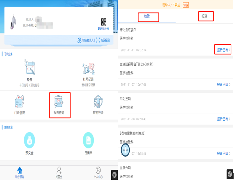 打開功能菜單界面,點擊【報告查詢】,進(jìn)入查詢界面后,可以選擇查詢【檢驗】或【檢查】已出的報告,點擊【報告已出】即可查看檢驗或檢查項目的詳細(xì)報告(僅供參考,以紙質(zhì)報告為準(zhǔn)。)