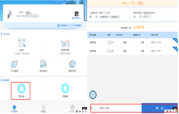 點擊功能菜單界面中的【預(yù)交金】,進(jìn)入預(yù)交金界面后,輸入需繳納金額,核對繳納信息,確認(rèn)無誤后點擊【確定】。