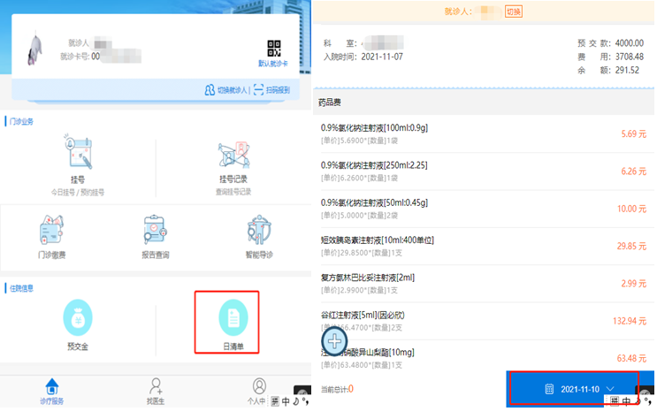點擊功能菜單界面中的【日清單】,進(jìn)入后可以查詢所有費(fèi)用明細(xì),包括【預(yù)交款】【費(fèi)用】【余額】,也可以按照日期去選擇查看某一天的費(fèi)用(點擊右下角日期選擇)。
