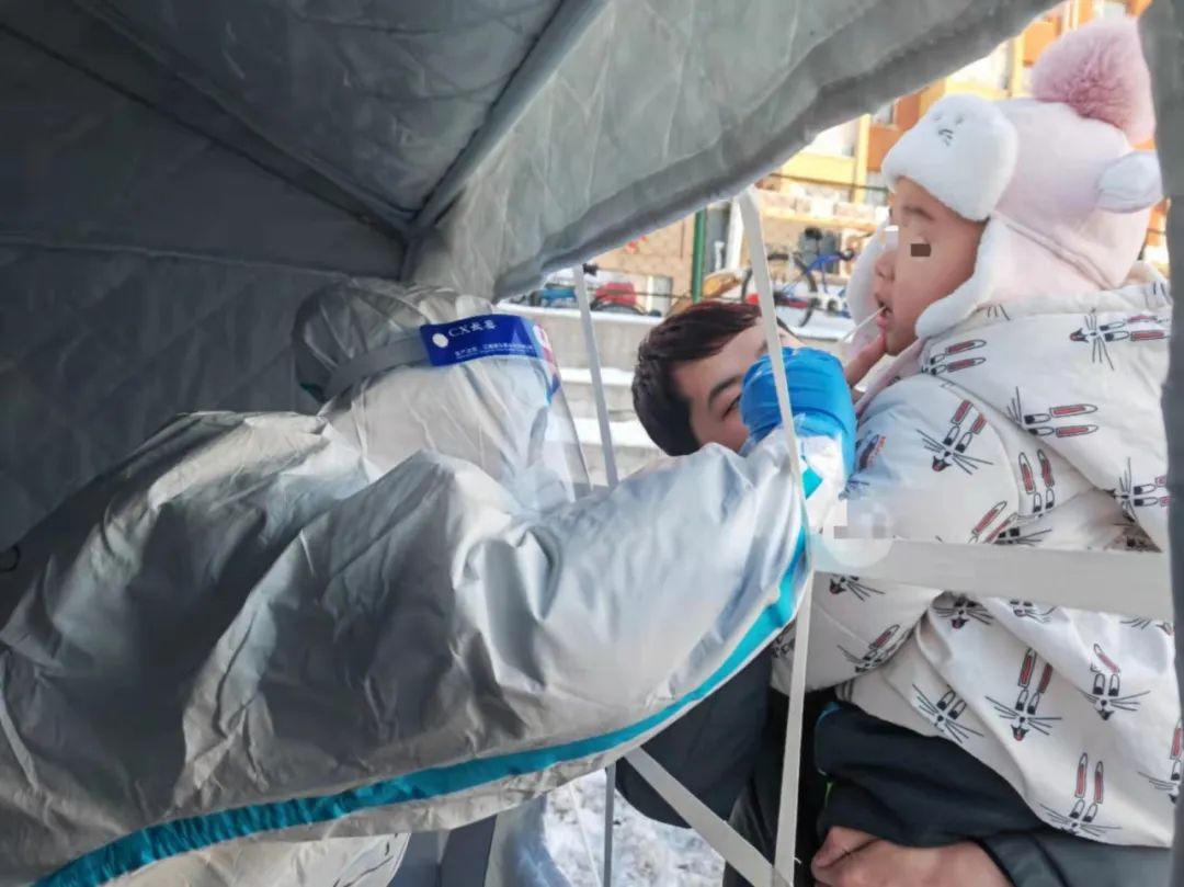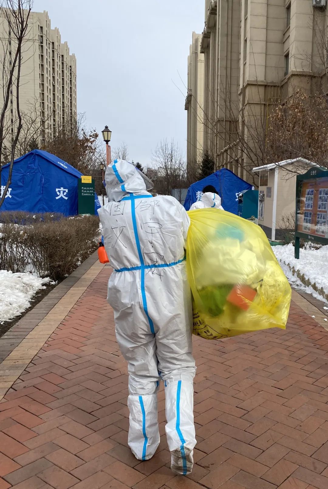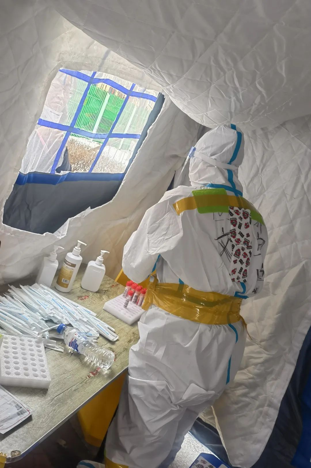 時間還未過去一個月,當我還沉浸在失去至親的痛苦中時,了解到疫情防控工作到了嚴重缺乏醫(yī)療人員的時期,主動請纓,擦干眼淚,收拾行囊,加入進疫情防控一線隊伍。我知道,這是我的使命,我與核醫(yī)學科護士團隊十人一往無前奔向抗疫前線。在漫天大雪紛飛中,大家一起穿著厚重的防護服前往九臺,在狹小的封控區(qū),與同事們互相一遍遍檢查防疫服穿戴規(guī)范后,馬不停蹄地展開我們的工作。