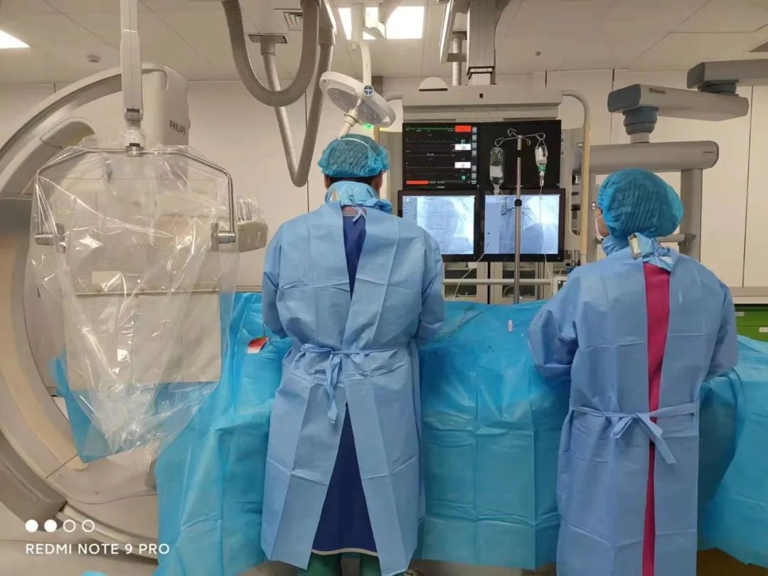 經(jīng)家屬同意,22時28分,患者轉(zhuǎn)運至導(dǎo)管室,開始實施急診PCI手術(shù)?;颊咴谘茉煊跋嘛@示見降支中段90%狹窄,右冠后降支95%狹窄,幾乎沒有血流,隨時可能發(fā)生不測,所幸的是國文醫(yī)院胸痛中心,流暢快速的運行機制,手術(shù)及時、血管開通及時、心肌供血恢復(fù)及時,讓患者成功得救,并順利度過危險期。同來的另一名患者也被收入心內(nèi)科的隔離病房,給予及時有效治療,情況良好。