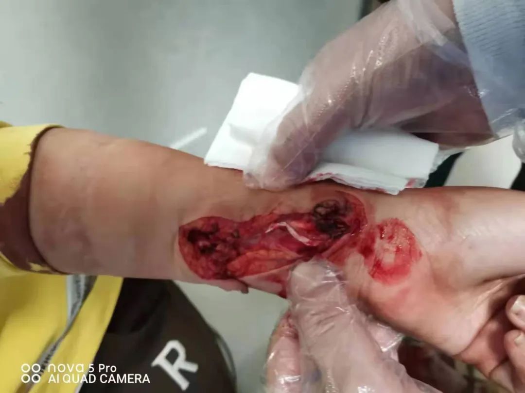 4月19日中午,急促的電話鈴聲響徹在急診室,電話的另一端傳來(lái)急切的語(yǔ)氣:一位12歲的小女孩,不小心被玻璃劃破了手臂,傷口深至肌腱,需要馬上進(jìn)行診治!急診救護(hù)車第一時(shí)間前往患者家中并同時(shí)聯(lián)系了骨科主任,骨科呂國(guó)福主任接到電話后,立即帶領(lǐng)骨科團(tuán)隊(duì),嚴(yán)格按照院感防控措施做好防護(hù),到達(dá)急診做好接診準(zhǔn)備。
