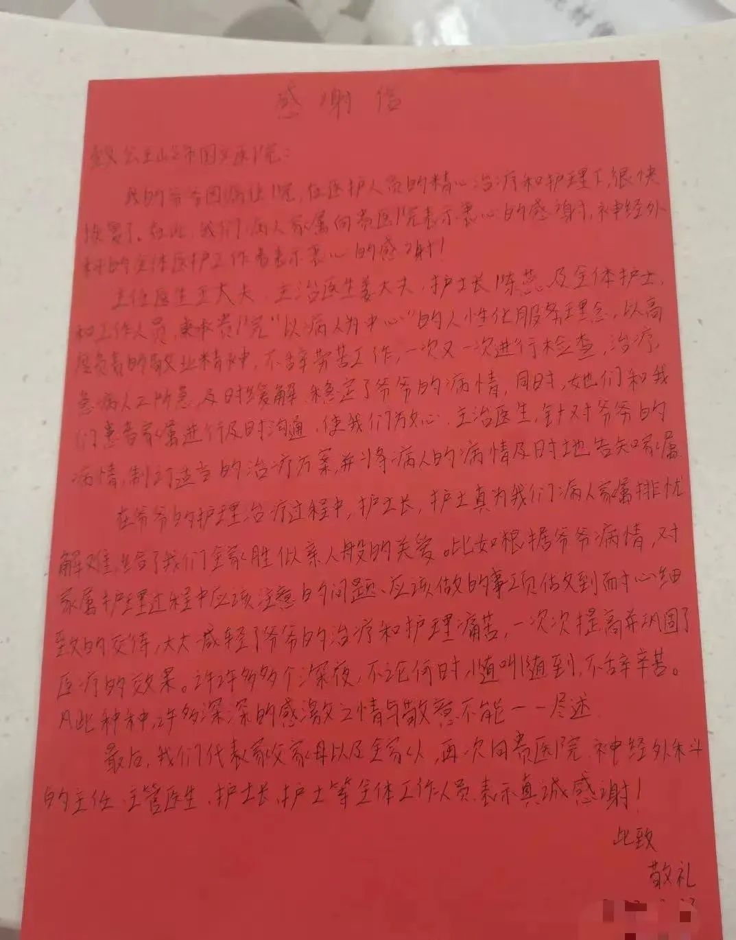 出院前患者家屬親手寫了感謝信并表示:我爺爺因病住院,在醫(yī)護(hù)人員的精心治療和護(hù)理下,很快就康復(fù)出院了,在此,我們向神經(jīng)外科的全體醫(yī)護(hù)工作者表示衷心的感謝!感謝你們“以病人為中心”的人性化服務(wù)理念,高度負(fù)責(zé)的敬業(yè)精神,不辭勞苦工作。