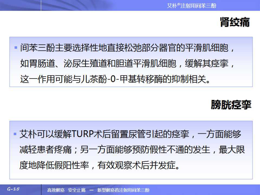 體內(nèi)、外試驗(yàn)結(jié)果顯示,間苯三酚主要選擇性地直接松弛部分器官的平滑肌細(xì)胞,如胃腸道、泌尿生殖道和膽道平滑肌細(xì)胞,緩解其痙攣,這一作用可能與兒茶酚-0-甲基轉(zhuǎn)移酶的抑制相關(guān)。間苯三酚在泌尿外科的應(yīng)用已有相關(guān)報(bào)道,研究結(jié)果顯示其在腎絞痛及膀胱痙攣治療中的效果確切,且不良反應(yīng)發(fā)生率極低。