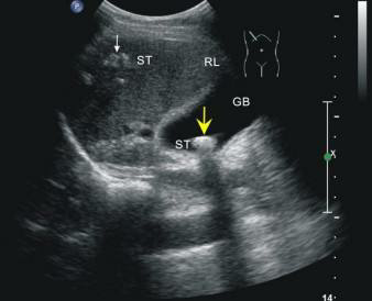 這位先生姓錢,自訴飲酒后出現(xiàn)胸骨后疼痛4小時(shí),呈壓榨性,持續(xù)不緩解,伴大汗、面色蒼白、惡心、欲吐,既往無(wú)高血壓、糖尿病、冠心病病史,吸煙史30年,偶有飲酒,入院時(shí)查體血壓為120/80mmHg,心率:98次/分,節(jié)律規(guī)整,未聞及明顯雜音。心電圖:竇性心律,心率98次/分,II、III、aVF導(dǎo)聯(lián)病理性Q波,ST段下移,不正常心電圖。不除外急性心肌梗死。急檢心肌酶及超敏肌鈣蛋白、淀粉酶,結(jié)果回報(bào)心肌酶、超敏肌鈣蛋白無(wú)明顯改變。疼痛時(shí)復(fù)查心電圖較前無(wú)變。胸痛癥狀仍持續(xù)不緩解,給予曲馬多止痛不改善。請(qǐng)示李桂武主任醫(yī)師,主任給予詳細(xì)詢問(wèn)病史、癥狀及查體,患者膽囊區(qū)有壓痛無(wú)反跳痛,考慮患者可能存在膽囊性疾病,不排除腎結(jié)石,指示:急檢肝膽胰脾彩超及泌尿系彩超。我急忙陪著患者及家屬去門診彩超室做肝膽胰脾及泌尿系彩超。結(jié)果如下圖。提示膽囊結(jié)石。