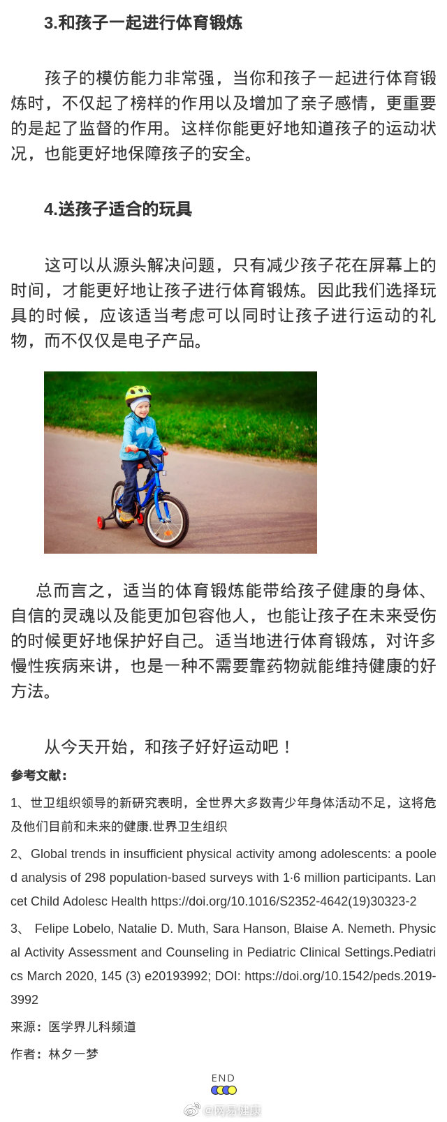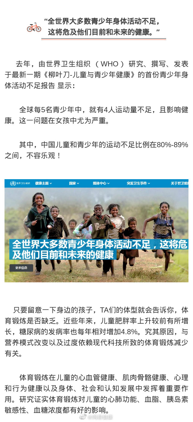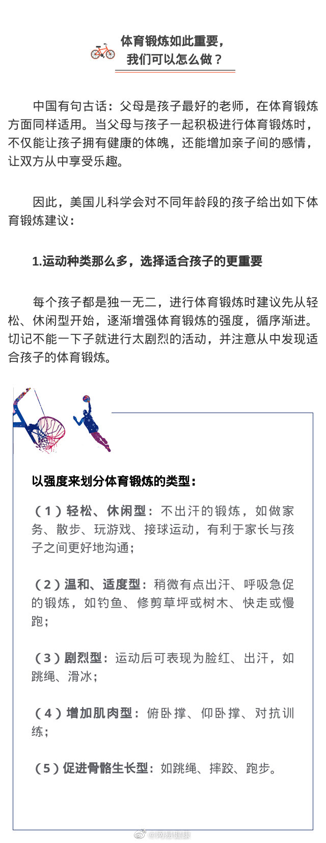 全球每5名青少年中,就有4人運(yùn)動(dòng)量不足,且影響健康,這一問題在女孩中尤為嚴(yán)重。其中,中國兒童和青少年的運(yùn)動(dòng)不足比例在80%-89%之間,不容樂觀!想帶孩子鍛煉,又怕TA在運(yùn)動(dòng)過程中受傷?快來看看美國兒科學(xué)會(huì)提出的兒童全年齡段運(yùn)動(dòng)建議吧!