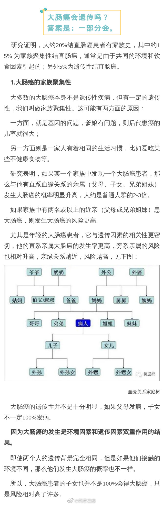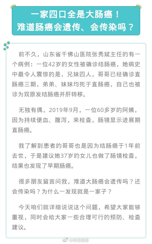 在很多病例中我們可以發(fā)現(xiàn),大腸癌經(jīng)常出現(xiàn)在同一家族。難道大腸癌會(huì)遺傳嗎?還會(huì)傳染嗎?為什么一發(fā)現(xiàn)就是一家子?