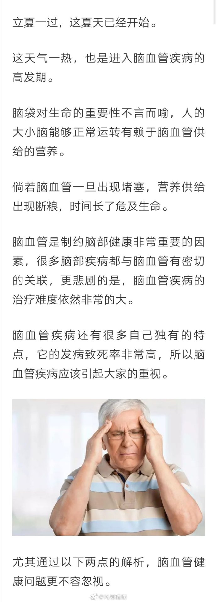 立夏一過,這夏天已經(jīng)開始。這天氣一熱,也是進入腦血管疾病的高發(fā)期。腦血管是制約腦部健康非常重要的因素,很多腦部疾病都與腦血管有密切的關(guān)聯(lián),更悲劇的是,腦血管疾病的治療難度依然非常的大。那么如何預防腦血管疾???在生活中,怎么做才能盡可能的避免發(fā)病呢?(來源:漫說健康)