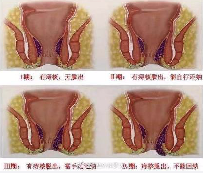 三期:大便帶血,便時肛內(nèi)腫物脫出,不可自行還納,需用手還納。