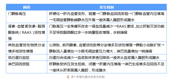 目前認為,肝硬化腹水形成的原因有:門靜脈高壓、腎素-血管緊張素-醛固酮系統(tǒng)(RAAS)活性增強、其他血管活性物質分泌增多或活性增強、低白蛋白血癥、淋巴回流受阻(表1)。