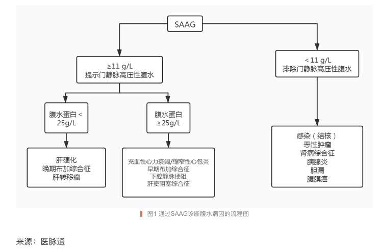 檢測血清-腹水白蛋白梯度(serum-ascites albumin gradient, SAAG)有助于判斷腹水的病因,對于既往無肝病史,初次就診的腹水患者的病因診斷有所幫助。SAAG即血清白蛋白與同日內(nèi)測得的腹水白蛋白間的差值[SAAG = 血清白蛋白(g/L)﹣腹水白蛋白(g/L)](“同日檢測”是關鍵?。AAG≥11 g/L有97%的概率為門靜脈高壓性腹水。SAAG<11 g/L的腹水多為非門靜脈高壓性。