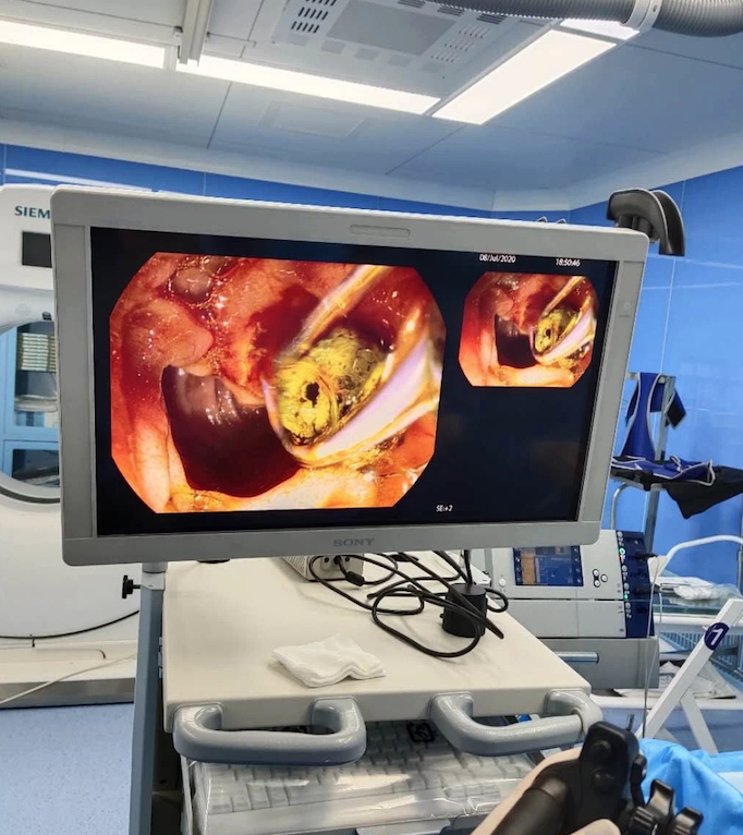 在梁博主任的帶領(lǐng)下,短短10分鐘,ERCP膽總管結(jié)石手術(shù)順利完成。隨后,立即為患者進(jìn)行了腹腔鏡下膽囊切除術(shù)。術(shù)程順利,全程無縫銜接,整個(gè)手術(shù)僅用時(shí)40分鐘。