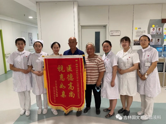 7月14日上午,吉林省舒蘭市患者崔萬均及家屬早就來到淋巴瘤血液腫瘤內(nèi)科病房,將一面寫有“視患如親,醫(yī)德高尚”的錦旗送到科室左主任的手上,感激地說:“感謝你們,是你們讓我有了生存下去的勇氣,是你們視我們?nèi)缬H人一樣,讓我們有家的感覺?!?/p>