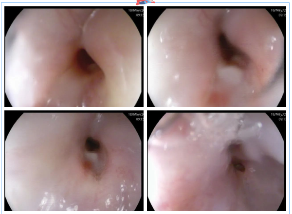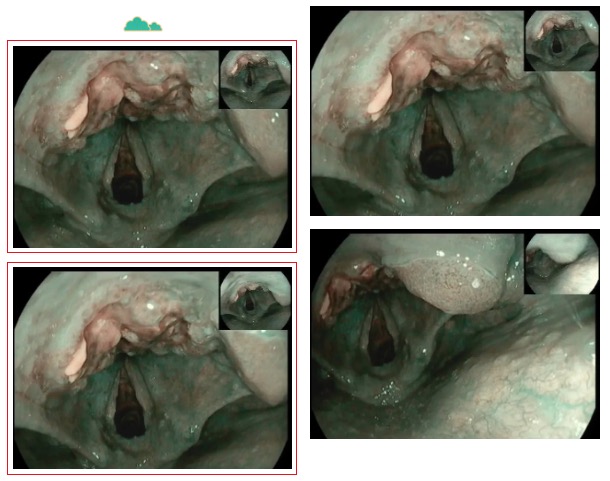 這時(shí),3診是一位懷疑食管瘺的患者,進(jìn)鏡至距門齒約25cm見食管管腔狹窄明顯,無法繼續(xù)進(jìn)鏡,狹窄處黏膜粗糙、色紅,可見潰瘍形成。嘗試給予胃營養(yǎng)管置入,插至距門齒約35cm處阻力過大,反復(fù)嘗試后,無法留置。