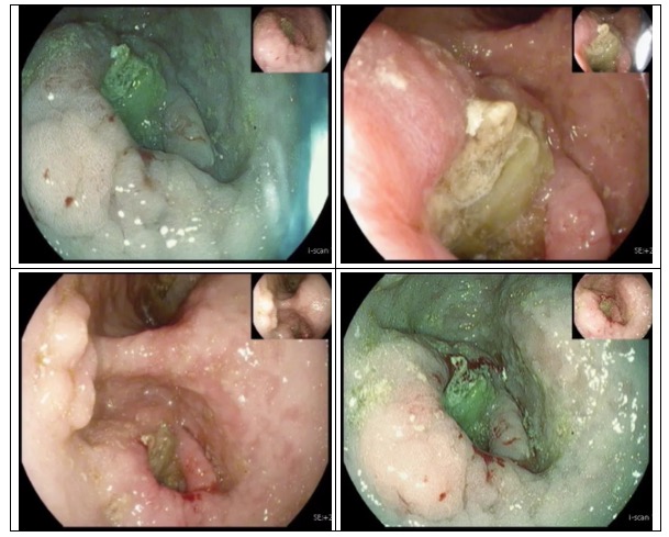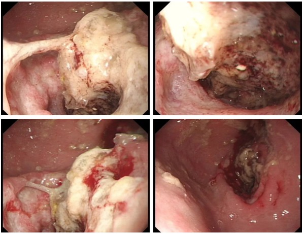 走進(jìn)6診,是一位71歲急診檢查的患者,患者胃內(nèi)大量食物潴留,視野欠清,胃竇及幽門見一不規(guī)則環(huán)形腫物,腫物表面污穢不平,管腔狹窄,內(nèi)鏡無法通過,胃竇前壁見約1.5*1.2cm丘狀隆起,中央凹陷。內(nèi)鏡醫(yī)生陳大夫給予病理活檢,待病理結(jié)果出來行進(jìn)一步治療。