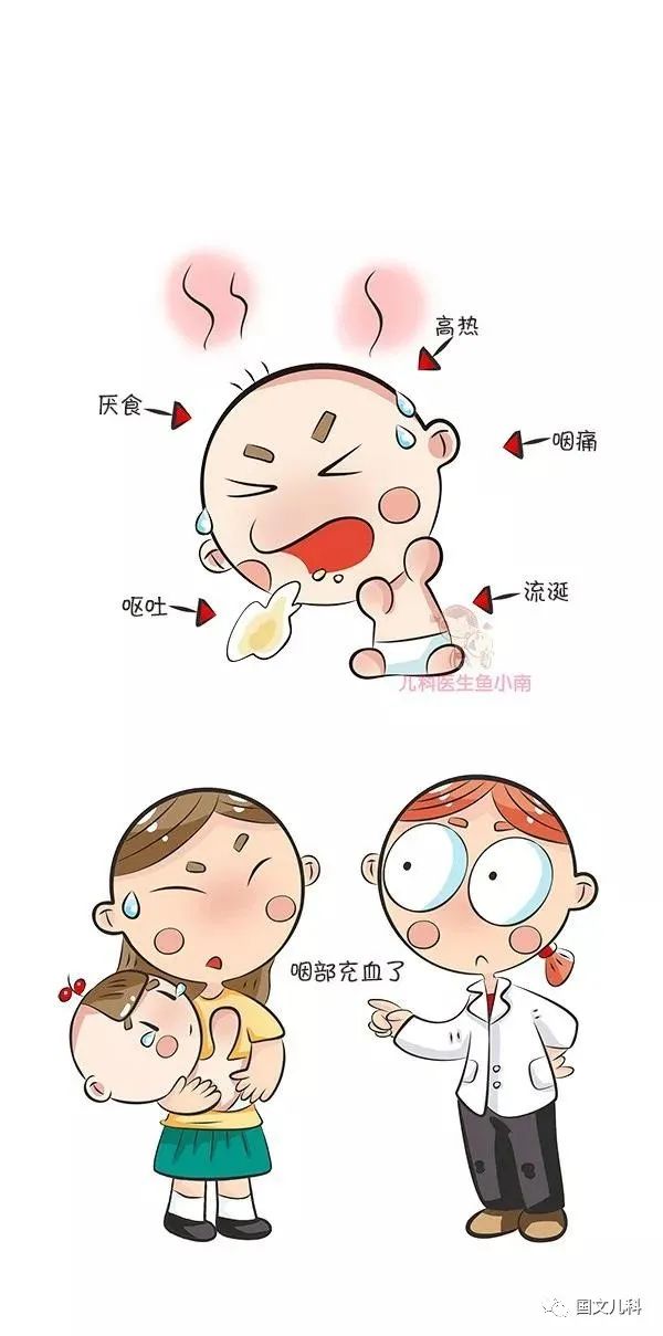 突起發(fā)熱無前驅癥狀,體溫多在38.5-40℃之間,熱程一般2-4天,年長兒可伴有乏力、頭痛、肌痛等。嬰幼兒可有納差、惡心、嘔吐、腹瀉等癥狀。咽部充血,可見灰白色皰疹,周圍紅暈,可累及軟腭、扁桃體、懸雍垂,但一般不累及齒齦及頰粘膜。全身及咽部癥狀一般需4-6天自愈,少數需2周,少有并發(fā)癥。?