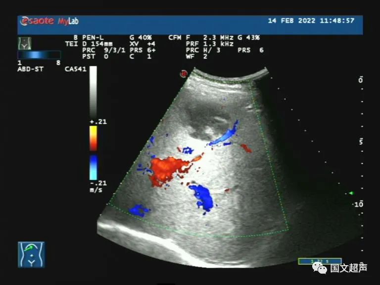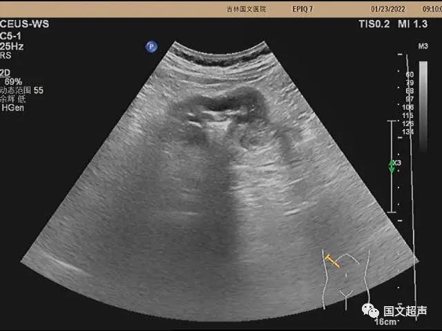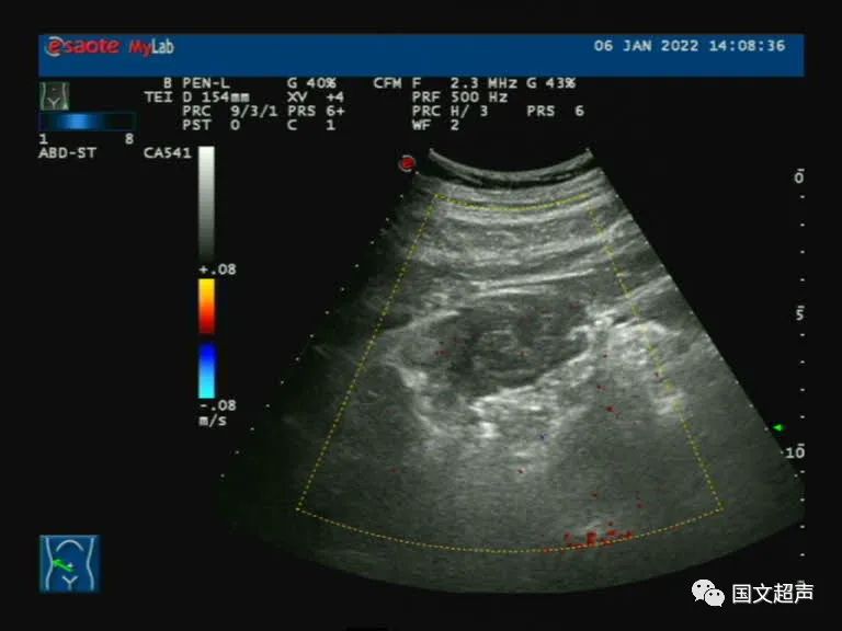 超聲檢查:右側(cè)結(jié)腸肝曲處腸壁不均勻性增厚,走行僵直,蠕動不佳,呈“假腎征”,術(shù)后病理:右側(cè)結(jié)腸低分化腺癌。