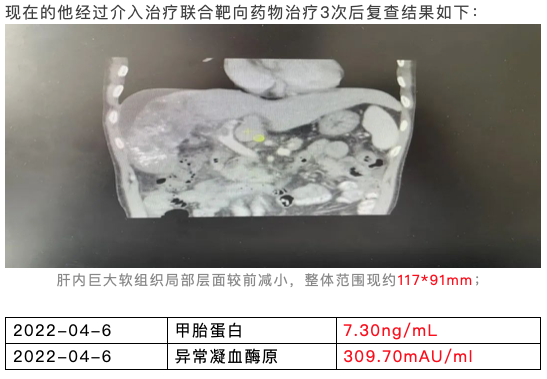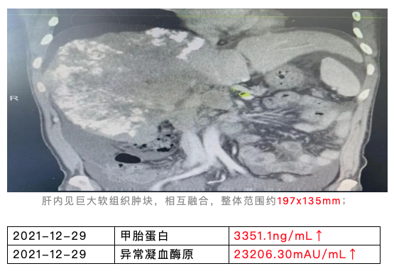 在我院通過肝臟CT平掃+增強顯示結(jié)果為:肝內(nèi)見巨大軟組織腫塊,相互融合,整體范圍約197x135mm;腫瘤標(biāo)記物:甲胎蛋白5360.1ng/mL↑,異常凝血酶原35486.30mAU/mL↑。腫塊在不斷擴大,病情不容樂觀,在完善相關(guān)檢查后,醫(yī)生于2021年12月20日在局麻下行TACE聯(lián)合HAIC治療并囑患者抗病毒及口服“侖伐替尼”治療。并于12月29日進行術(shù)后復(fù)查: