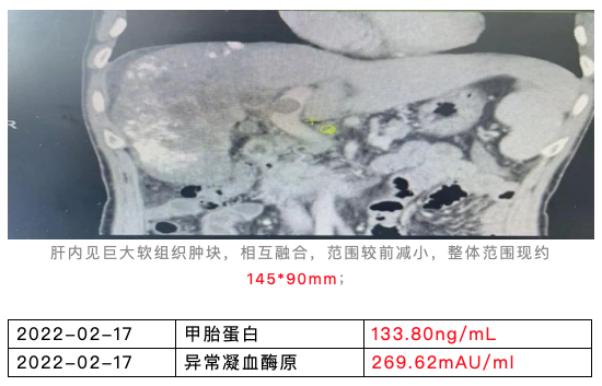 程先生治療后自覺體力和精力都有所提升。治療的效果和醫(yī)生的開導(dǎo)讓他更加充滿信心,他積極配合治療。在2022年2月17日再次來我院檢查,檢查結(jié)果讓程先生看到了希望,腫瘤和轉(zhuǎn)移較前縮小,介入治療給了他二次生命。在完善相關(guān)檢查后,于2022年2月23日再次在局麻下行TACE聯(lián)合HAIC治療并抗病毒及口服“侖伐替尼”治療。