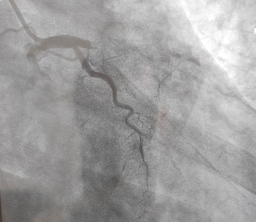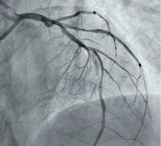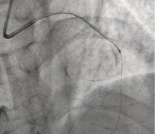 立即啟動綠色通道,急診冠脈造影,結(jié)果顯示前降支近段閉塞,血栓負(fù)荷較重,先后給予血栓抽吸及球囊擴張,血流恢復(fù)正常。李桂武主任和劉興剛主任發(fā)現(xiàn)患者近段狹窄達70%,且中遠(yuǎn)段嚴(yán)重狹窄伴鈣化,此時不適合同期植入支架,如植入支架可能會引發(fā)血管破裂危及生命。當(dāng)務(wù)之急是快速評估出患者是否可以下手術(shù)臺,選擇擇期進行處理,但僅根據(jù)造影結(jié)果又很難做出判斷,李桂武主任和劉興剛主任快速討論研究最后一致決定,給予患者行冠脈OCT檢查,明確病變性質(zhì)。
