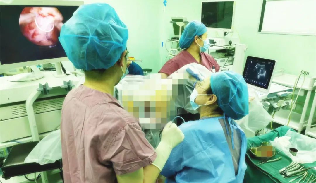 為降低術(shù)中出血風(fēng)險(xiǎn),術(shù)前高虹霞主任予以患者行藥物殺胚治療,使血HCG值降到安全數(shù)值,因妊娠囊完全著床于子宮瘢痕處,該處有效肌層厚度≤3mm,僅為2.4mm,屬于最嚴(yán)重的Ⅲ型瘢痕妊娠,術(shù)中極容易發(fā)生子宮破裂,對(duì)此高主任決定在超聲監(jiān)視下行清宮手術(shù),一旦子宮出現(xiàn)破裂,則立即行腹腔鏡下修補(bǔ)術(shù),在做好一切術(shù)前準(zhǔn)備后,這場(chǎng)極高風(fēng)險(xiǎn)的瘢痕妊娠清宮手術(shù)開始。