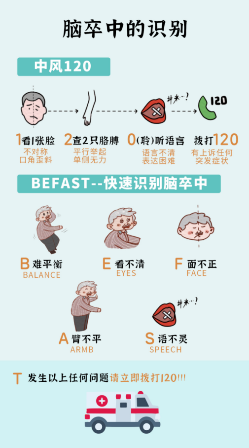 專家提醒:腦卒中發(fā)病急、進(jìn)展快,一旦出現(xiàn)以下癥狀,請(qǐng)立即撥打120急救電話:* 突發(fā)一側(cè)肢體無(wú)力或麻木* 突發(fā)口角歪斜、流口水* 突發(fā)言語(yǔ)不清或理解語(yǔ)言困難* 突發(fā)單眼或雙眼視力模糊* 突發(fā)眩暈、嘔吐、行走不穩(wěn)* 突發(fā)劇烈頭痛。