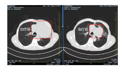 在國文醫(yī)院胸部腫瘤放化療Ⅲ病區(qū)醫(yī)護人員的精心照料和密切監(jiān)測下,患者經(jīng)過6周期的免疫治療,肺部腫瘤明顯縮小,一年間由原來的95x90mm降至70x50mm,腫瘤明顯縮小且腫瘤內(nèi)見壞死及空洞。張大爺?shù)纳眢w狀況也逐漸好轉(zhuǎn),原本因癌細胞壓迫導(dǎo)致的呼吸困難癥狀得到了明顯緩解,能夠進行一些簡單的日?;顒?,張大爺?shù)哪樕嫌种匦戮`放出笑容。