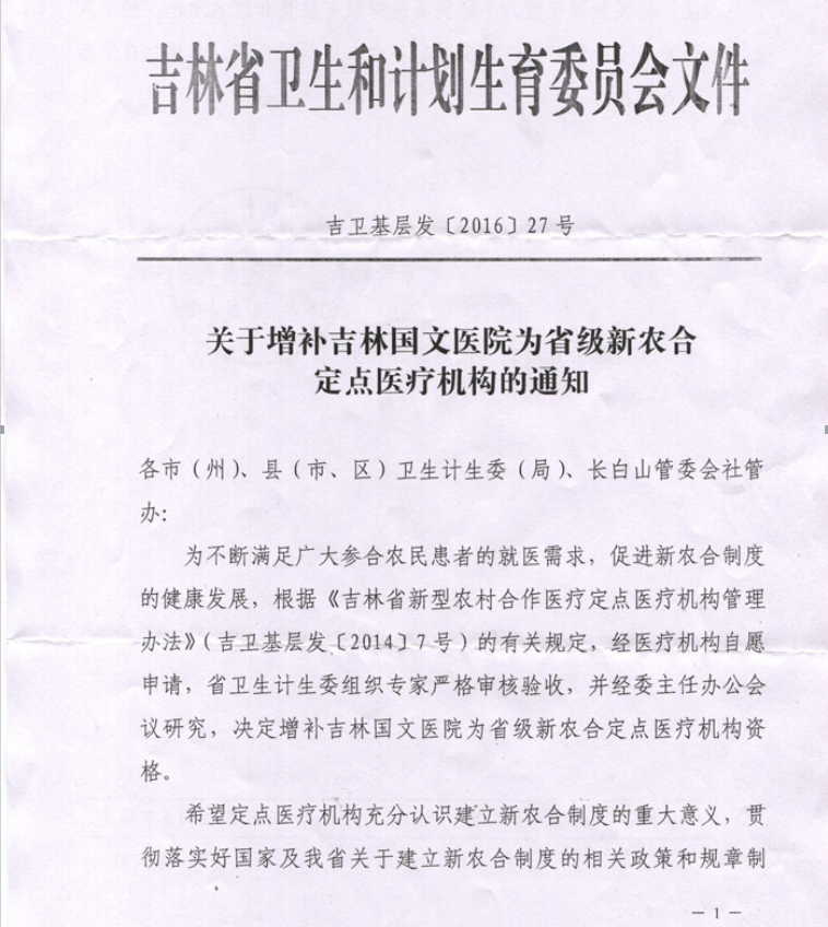 11月1日,吉林國文醫(yī)院被吉林省衛(wèi)生計生委批準(zhǔn)為省級新型農(nóng)村合作醫(yī)療定點(diǎn)醫(yī)療機(jī)構(gòu),這是我省除省城長春市外的首家省級新型農(nóng)村合作醫(yī)療定點(diǎn)醫(yī)院。