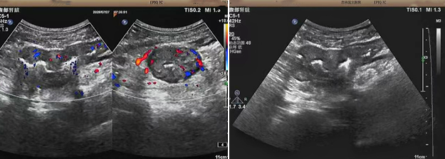 轉(zhuǎn)診至我院后,腸鏡檢查有了重要發(fā)現(xiàn) —— 王女士腸道內(nèi)存在不規(guī)則腫物,腫物表面出現(xiàn)潰爛出血的情況,還導(dǎo)致了腸腔狹窄。這一發(fā)現(xiàn)讓病情的排查有了方向,隨后超聲科接診,立即啟動重點探查,力求更精準(zhǔn)地了解病變情況。