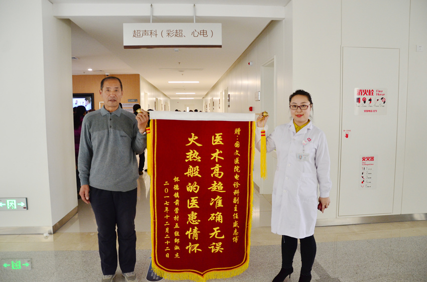 患者加護(hù)田文龍說,患者是腎結(jié)石疾病,在來我院之前,在鄉(xiāng)下的醫(yī)院做了彩超,沒查出來。來我院盛主任給查出來了,之前就有多次彩超是盛志博主任給做的,非常好。之前還不太相信盛主任,后來去醫(yī)大又做的,跟盛主任檢查的一樣,盛主任做的檢查,真的很準(zhǔn)確。解釋的清楚明白,百問不厭,患者用十六個(gè)字概括“醫(yī)術(shù)高超,準(zhǔn)確無誤,血熱般的醫(yī)患情懷”,患者打算給盛主任做一面錦旗。