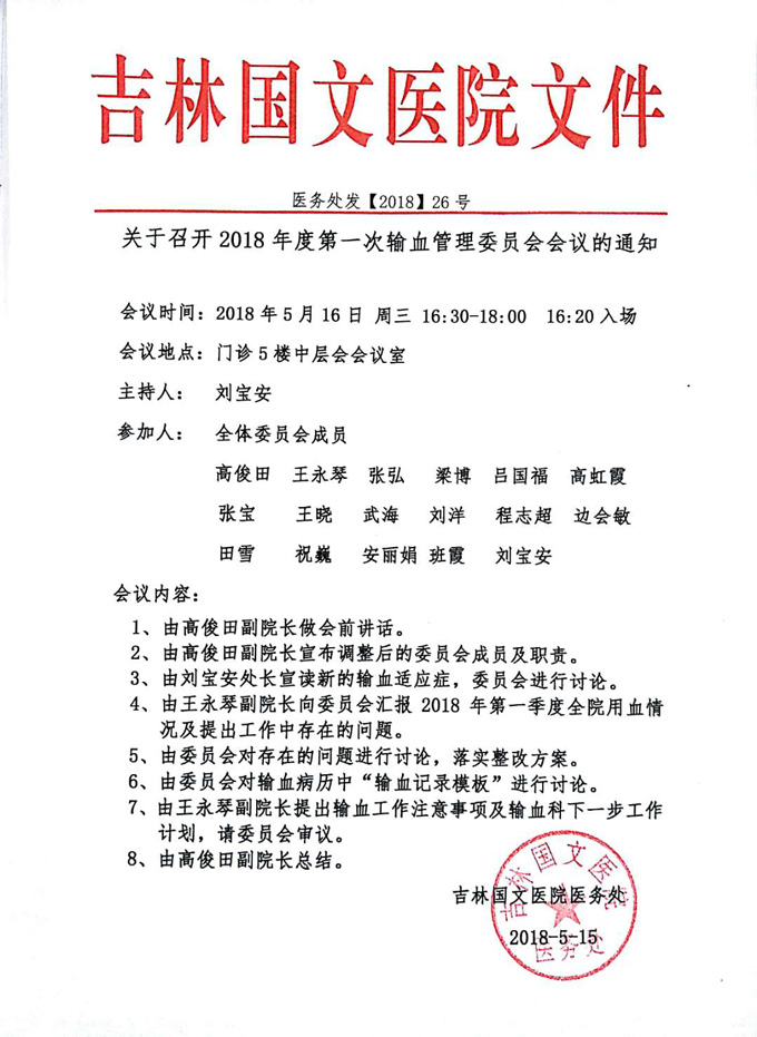 關(guān)于召開(kāi) 2018 年度第一次輸血管理委員會(huì)會(huì)議的通知