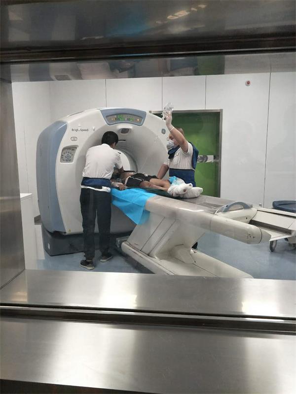 不遠(yuǎn)處可見120秦屯分站救護(hù)車正急速駛向我科,當(dāng)患者被抬下車查看患者意識(shí)模糊,躁動(dòng);而后迅速將患者安全安置在平車上緊接著將患者送往急診搶救室,我們科外科王明偉醫(yī)生也對(duì)患者全面查體,發(fā)現(xiàn)患者雙下肢都有明顯開放傷口,立即對(duì)傷口進(jìn)行加壓包扎,這時(shí)秦屯分站的救護(hù)車醫(yī)生也做了交接工作,患者是車禍外傷,到達(dá)現(xiàn)場時(shí)有兩名患者,一位當(dāng)場死亡,另一位則被送到我院,患者四肢頭面部均有開放傷,由于患者處于意識(shí)模糊狀態(tài),查體不配合也成為了較困難的干擾因素,外科醫(yī)生及時(shí)下達(dá)醫(yī)囑建立靜脈通路,由于患者的失血量可能過多,導(dǎo)致血管不充營,對(duì)護(hù)士進(jìn)行留置針穿刺術(shù)也考驗(yàn)的一定的專業(yè)素質(zhì),而我科搶救室護(hù)士迅速執(zhí)行完醫(yī)囑,并跟隨我科出診醫(yī)生去做相關(guān)的檢查。檢查也有了難題,由于患者處于意外事故,并沒有家屬陪同,關(guān)鍵患者是躁動(dòng)加上意識(shí)不清,對(duì)于CT檢查也是嚴(yán)重的不配合,為了讓及時(shí)的檢查順利進(jìn)行,我科兩名出診醫(yī)生,田益竹、姜超穿上了鉛衣,負(fù)責(zé)固定注患者的體位,和液體的及時(shí)補(bǔ)充,檢查出骨盆粉碎性骨折,CT值班人員也幫助迅速出片,在電話與外科醫(yī)生做了溝通后,我科醫(yī)護(hù)迅速將患者送往ICU,完成了一次順利的綠色通道。