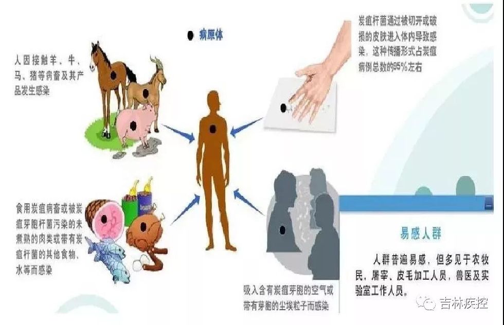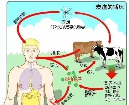 人通常是通過接觸患病動物或動物制品被感染。大多數(shù)情況下,牛馬羊等食草動物在吃草時攝入芽孢引起感染,人在未知情況下對病死牲畜進(jìn)行剖解、剝皮及肉類等動物制品的搬運(yùn)、加工處理中,因裸露的皮膚存在破損或傷口而造成感染,這是最常見的感染接觸方式。