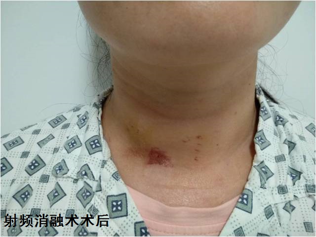 呂**,發(fā)現(xiàn)頸前腫物2月余。本院甲狀腺彩超檢查報(bào)告:甲狀腺右葉前后徑1.6cm,腺體中部探及結(jié)節(jié)大小約1.5*2.2cm,低回聲結(jié)節(jié),邊界清,左葉前后徑0.9cm,雙葉腺體回聲略紊亂。雙側(cè)頸鞘及鎖骨上區(qū)探及多枚扁平淋巴結(jié)。檢查結(jié)果:甲狀腺結(jié)節(jié)--右葉;甲狀腺彌漫性病變(甲狀腺炎?)符合射頻消融手術(shù)適應(yīng)癥。給予在靜脈復(fù)合麻醉下行超聲引導(dǎo)甲狀腺右葉腫物射頻消融術(shù)。術(shù)后恢復(fù)良好。今日術(shù)后第一天,患者無明顯不適,活動自如,飲食正常,頸部未見明顯瘢痕。