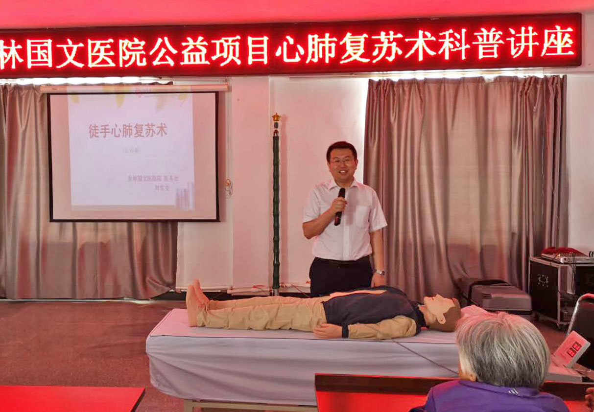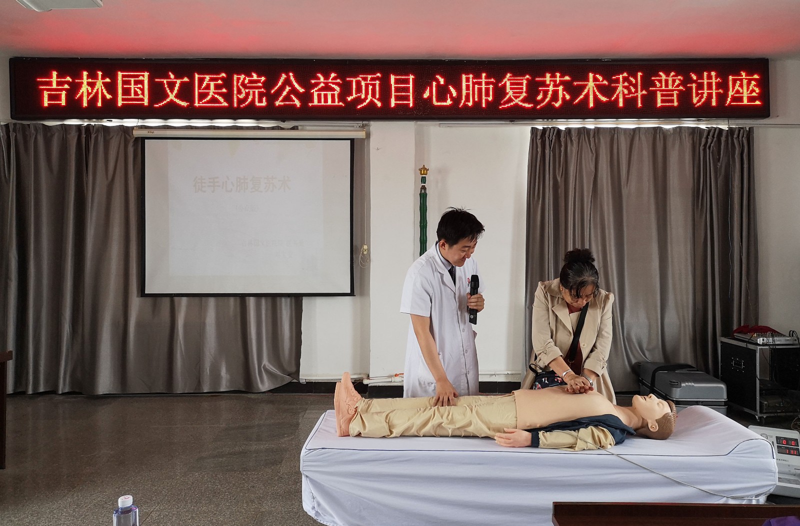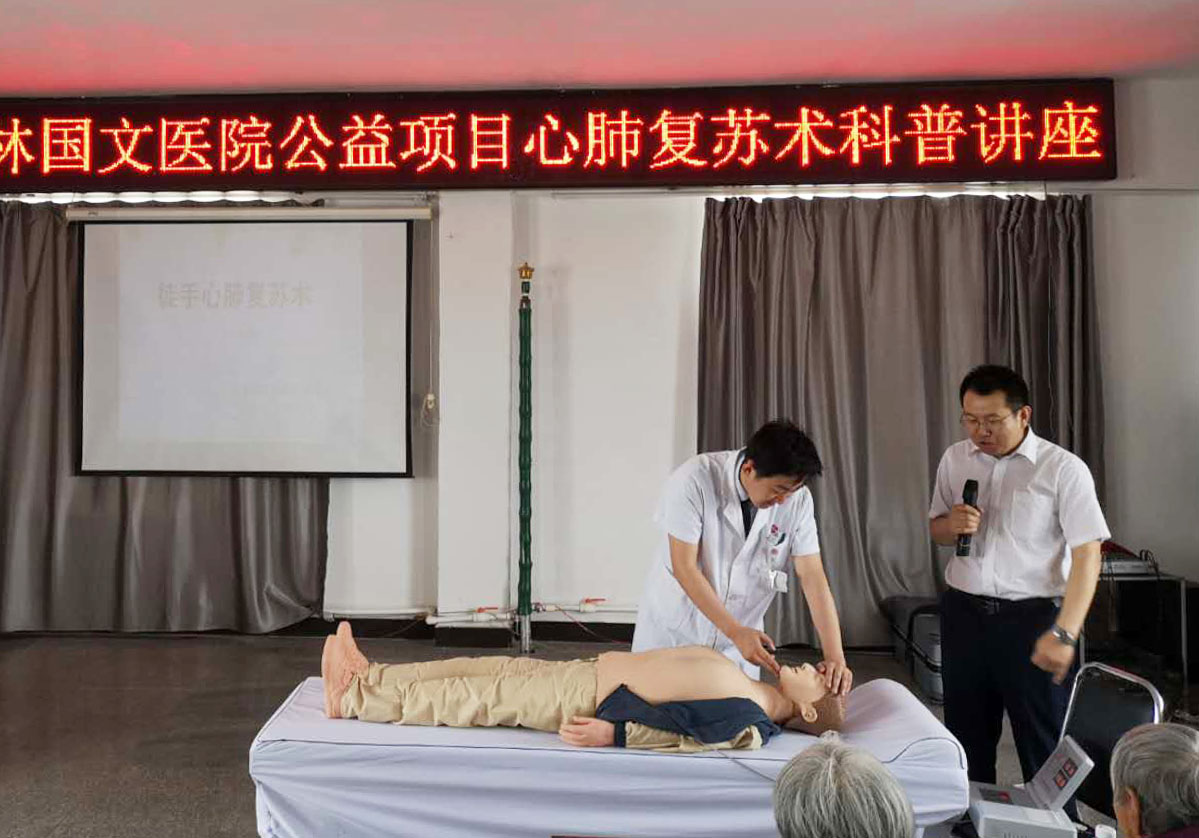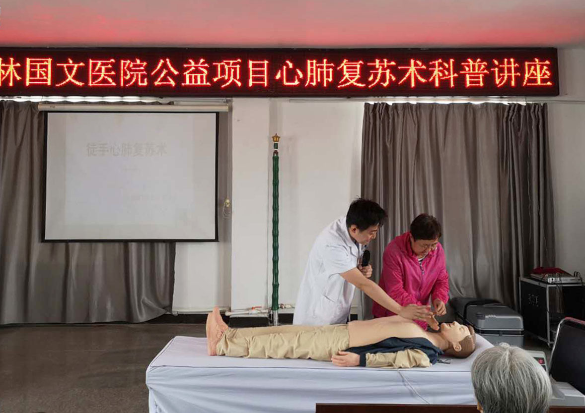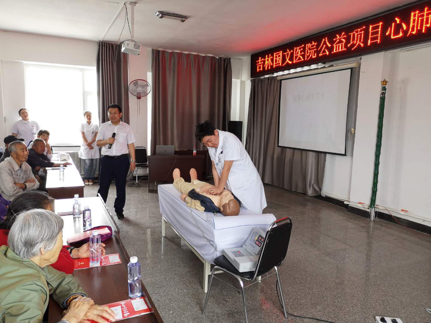 按照吉林國(guó)文醫(yī)院黨委發(fā)起醫(yī)務(wù)處承辦的心肺復(fù)蘇公益推廣項(xiàng)目,堅(jiān)守保護(hù)人的生命和健康的宗旨,5月31日,在吉林國(guó)文醫(yī)院醫(yī)務(wù)處組織下,心肺復(fù)蘇項(xiàng)目推廣小組進(jìn)入公主嶺市嶺東街道黃龍社區(qū)開(kāi)展主題為“國(guó)文醫(yī)院心肺復(fù)蘇講座”的公益活動(dòng)。本次活動(dòng)為該社區(qū)120余名社區(qū)人員進(jìn)行現(xiàn)場(chǎng)急救知識(shí)培訓(xùn),普及應(yīng)急知識(shí)。